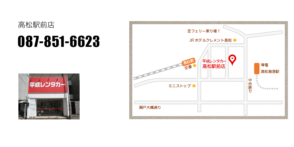 平成レンタカー高松駅前店 JR高松駅から徒歩1分。高松港フェリー乗り場も近くです。 あのうどん店にも迷わず行ける、うどんマップが大好評! 平成レンタカー高松駅前店 電話:087-851-6623 年中無休 AM9:00~PM6:00 高松市寿町1-1-22
