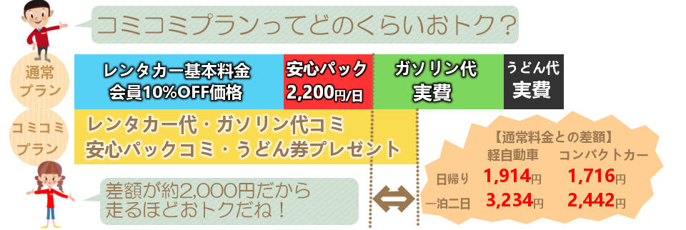 【計算式】9,460円(軽の日帰りコミコミ)-5,346円(軽当日まで10%OFF)-2,200円(安心パック1日分)=1,914円