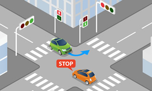 When turning right, you must give priority to oncoming cars driving straight and turning left. Pease be aware of pedestrians while turning right or left at an intersection.