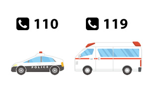 In the case of an accident, look around first and check the situation. Then call police on 110 to report the situation of the accident and the location. Please call an ambulance on 119 if there are any injuries. You are required to call the police immediately at the accident location no matter how minor the accident is.