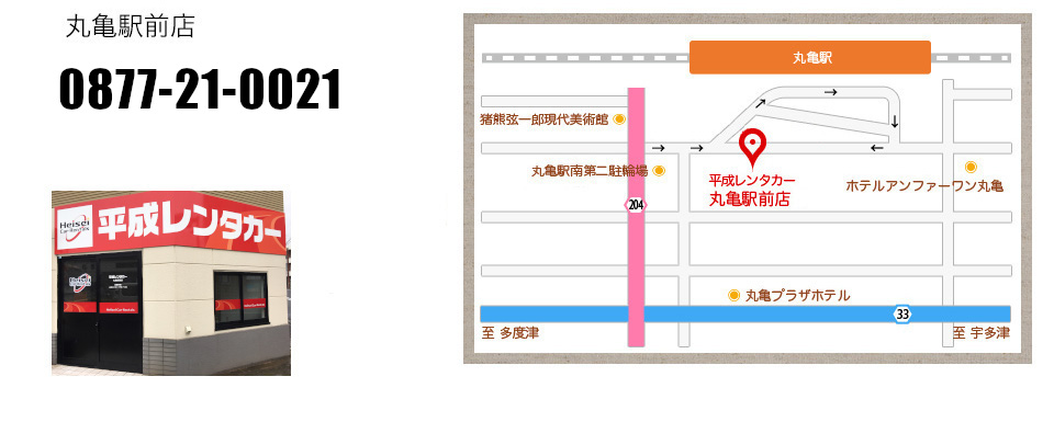 平成レンタカー丸亀駅前店 JR丸亀駅すぐ前のお店です! 有名うどん店ひしめくエリアです。うどんマップで満喫してください! 平成レンタカー丸亀駅前店 電話:0877-21-0021 年中無休 AM9:00~PM6:00 丸亀市浜町29