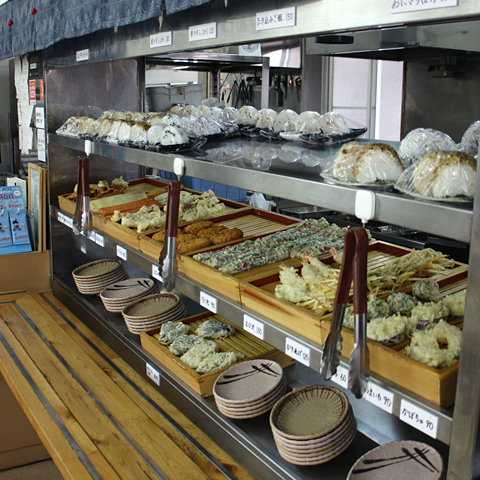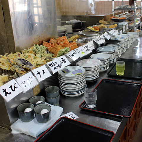 揚げたての天ぷらが人気で、半熟卵・ちくわ・げその3種類は、注文すると揚げたてサクサクで出てきます。もっちりした麺にすっきりおいしいダシをかけ、天ぷらをのせていただきましょう。