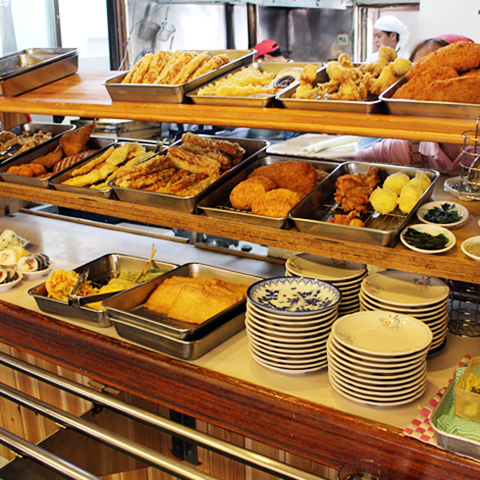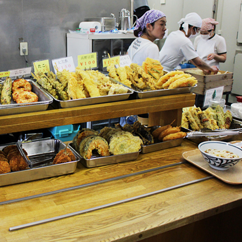 駐車場は18台分ありますが、昼時はすぐ満車になるので付近の有料駐車場を利用しましょう。完全セルフ店なので、うどんの玉も自分で茹でます。できたての喉越しのよい麺に、いりこの旨みの効いたダシをかけていただきます。味が浸みこんだ高野豆腐の天ぷらがあり、人気です。